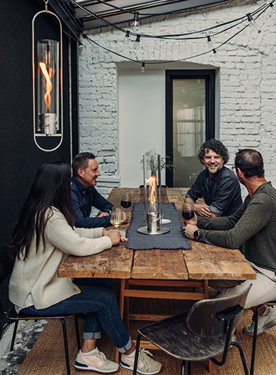 SPIN Hängesystem - Wie von Zauberhand schwebt der Flammenwirbel im Raum und wird zum eindrucksvollen Blickfang im Innen- und Außenbereich. Ohne Aufwand und Werkzeug wird der Flügelkörper in den geschwungenen Rahmen geschraubt und an einem stabilen und zugleich eleganten Edelstahlseil befestigt. Sofort hebt das Tischfeuer ab und kann in flexibler Höhe an einem Haken aufgehängt werden.